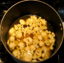Довести бульон до кипения, добавить потрошки и цветную капусту. Через 5 минут добавить картофель, довести до кипения, снять пену (по желанию), посолить и поперчить по вкусу.