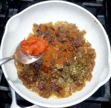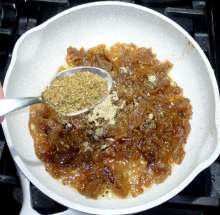 В растопленное масло выложить жареный лук. Добавить Уцхо сунели.