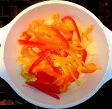 | Консервированный лосось, сладкий перец, эстрагон, сливочное масло. | Небольшие куски консервированного лосося тушатся вместе с овощами с добавлением зелени и сливочного масла. |