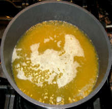 Тем временем подготовить бульон. Если он был заморожен - разморозить заранее (достав из морозильника утром).
