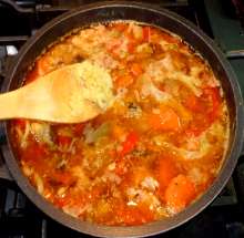 Если овощного бульона в холодильнике не оказалось - замените его кипятком.Если жареных грибов нет - используйте жареный лук. Если и его нет - поджарьте луковицу вместе с остальными овощами (см. ниже).