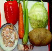 | Свиная тушонка, свежая капуста, болгарский перец, горчица | Готовится зажарка из болгарского перца, моркови и сельдерея на жире из тушонки с томат-пастой, добавляются жареные грибы с луком, овощной бульон, жидкость из банки. В суп опускается капуста, а через 5 минут - картофель и нарезанная кубиками тушонка. По готовности картофеля щи заправляются рубленным чесноком и горчицей. |