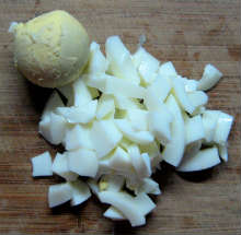 Разделить вареные желтки и белки. Белки мелко нарезать. Приготовить овощную смесь, как для окрошки, но без желтков.