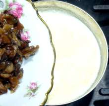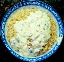 | Жареные грибы с луком, тёртый сыр. | Готовится соус "Бешамель", в него добавляются жареные грибы с луком и тёртый сыр. Отваривается лапша быстрого приготовления, откидывается на сито, соединяется с приготовленным соусом. При подаче заправляется зеленью. |