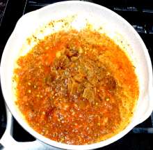 Выложить натёртые помидоры в разогретую сковороду с растительным маслом, посолить, добавить любимые специи (у меня - сухой базилик, уцхо-сунели, копченый перец). Перемешать, прогреть до кипения.