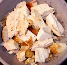 Остатки курицы нарезать небольшими кусками.