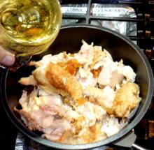Выложить курицу в толстостенный казанок, добавить вино. Накрыть крышкой, прогреть на малом огне несколько минут.