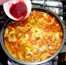 | Соус Ткемали, белое вино, сливочное масло, помидоры консервированные, уцхо-сунели (хмели-сунели), паприка, чеснок. | Небольшие куски курицы выкладываются в кастрюлю, последовательно добавляются белое вино, консервированные помидоры, томленый лук, соус ткемали, специи и блюдо тушится в собственном соку 10-15 минут, а затем заправляется чесноком и зеленью. |