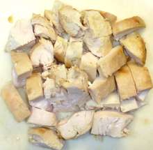 Если у вас нет жареной курицы - возьмите сырую грудку, нарежте кубиками, обваляйте в муке и обжарьте на сливочном масле 4 минуты - только до побеления кусочков, а не до корочки. Важно курицу не переготовить.