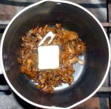В сотейник выложить грибы с луком, вторую половину сливочного масла. Прогреть на малом огне до расплавления масла.