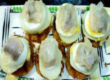 | Подсушенный на гриле хлеб. | Из чёрного/серого хлеба вырезаются кружки, сбрызгиваются оливковым маслом, запекаются в электрогриле до коричневых полосок, смазываются сливочным маслом, последовательно накрываются кружками картофеля, яиц. Поверх яйца выкладываются кусочки селёдки и нарезанный лук. |