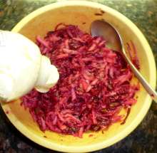 Достать запеченную свёклу, очистить, натереть на крупной тёрке.