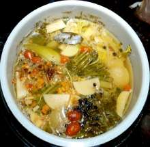 Свекла, капуста, помидоры, фасоль, уксус | Варится бульон из головы лосося (или другой красной рыбы), процеживается. В кипящий бульон последовательно добавляются капуста, овощная зажарка (пассерованные морковь и лук, чеснок, помидоры, томатная паста, рыбный бульон), тушеная с добавлением уксуса свекла. Суп довариватеся до готовности капусты, снимается с огня и настаивается. При подаче в тарелки возвращаются кусочки головизны. |
