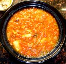Сухие и свежие грибы, помидоры. | Картофель, рыбное филе, поджаренные овощи, сухие и свежие грибы помещаются в горшок медленноварки (или порционные горшочки), заливаются рыбным бульоном и томятся до готовности картофеля. Незадолго до окончания варки добавляются свежие помидоры. Готовый суп заправляется чесноком и зеленью. |