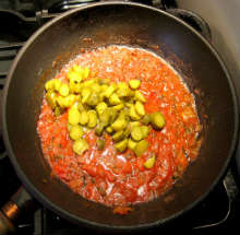 Выложить маслины и каперсы в кастрюлю. Потомить на малом огне. Добавить рассол и (или) лимонный сок по вкусу.
