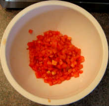 Пока бульон варится, залить помидоры кипятком, снять шкурку, нарезать мелкими кубиками.