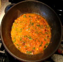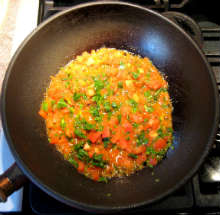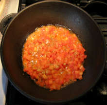 Разогреть сковороду с растительным маслом, выложить помидоры.