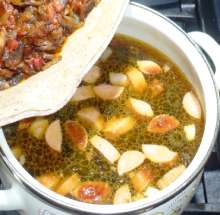 Поджарить мясные продукты до легкой корочки, выложить в кастрюлю, залить процеженным бульоном.