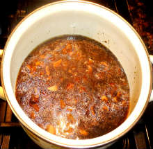 Выложить размолотые сухие и обжаренные с луком грибы в кастрюлю, развести куриным бульоном, проварить на малом огне 40 минут.