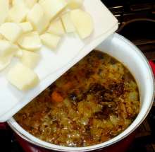 Если у вас обычная перловка – самое время добавить её в кастрюлю. В этом случае нужно будет варить суп 30 минут до того, как добавить картофель. Мясо тоже можно в этот момент вернуть в кастрюлю, но я предпочитаю класть его в тарелки при подаче – так справедливее.
