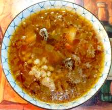 Говядина, топленое масло, лимон, кинза. | Варится говяжий бульон, процеживается, в него добавляется грибной отвар, отваренные, затем обжаренные сухие грибы, картофель, овощная зажарка (лук, морковь). Суп варится до готовности картофеля. При подаче добавляется предварительно отваренная перловка, кусочки мяса из бульона, лимонный сок по вкусу. |