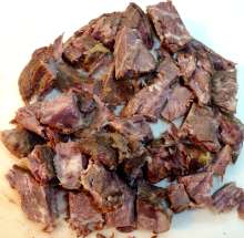 Остывшее мясо нарезать небольшими кубиками.