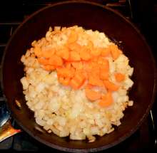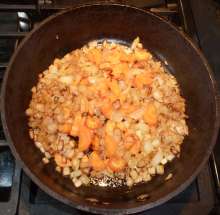 Добавить в сковороду, когда лук станет прозрачным.