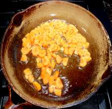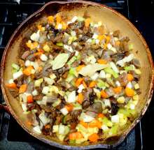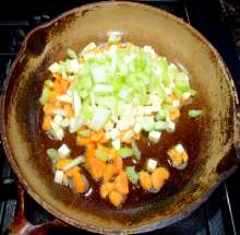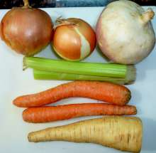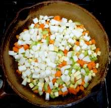 В оригинальном рецепте все ингредиенты поджариваются вместе. Это чревато потерей вкуса – овощи имеют разную температуру готовности и лук может либо остаться сырым, либо пережариться. Лучше поджарить его отдельно.Корень петрушки нарезать мелким кубиком.