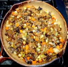 Перловая крупа, брюква | Коренья (лук, морковь, корень петрушки, стебель сельдерея, брюква) обжариваются вместе с предварительно отваренными грибами на растительном масле, добавляются в отвар от сухих грибов, варятся 10 минут, затем добавляется картофель и суп доваривается до готовности картофеля. При подаче добавляется отваренная перловка, суп заправляется сметаной. |