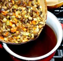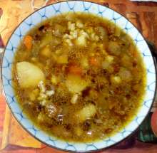 Если вы планируете съесть суп за один день – самое время добавить в кастрюлю отваренную перловку. В противном случае лучше добавлять её в тарелки при подаче, иначе за сутки она разбухнет и выпьет весь бульон.