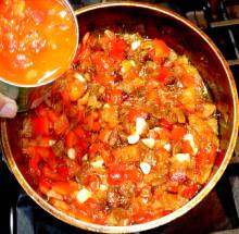 В оригинальном рецепте чеснок загружается в сковороду вместе с остальными овощами, но я не считаю это правильным, потому что чеснок жарится минуты и если пригорит – весь суп будет горчить. Если у вас свежие помидоры – их нужно обдать кипятком, выложить в ледяную воду, затем снять шкурку и нарезать мелким кубиком.