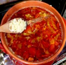 Вкус борща должен стать кисло-сладким. Это регулируется количеством маринада. Если маринад израсходован, а нужного вкуса добиться не удалось – добавьте уксус или сахар.В оригинальном рецепте чеснок кладётся в начале варки, что не имеет смысла – чесночный аромат исчезнет при длительной термообработке.
