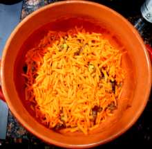 Морковь натеретть на крупной тёрке или нарезать соломкой.