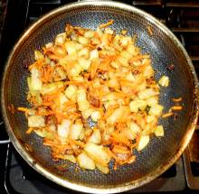 В некоторых рецептах готовая свекла используется без тушения, её прямо добавляют в тарелку, но я считаю, что в этом случае блюдо проигрывает и по цвету, и по вкусу.Выложить лук в нагретую сковороду с растительным маслом.