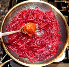 Лимонный сок на этом этапе добавляется не только для кислотного баланса, но восновном для сохранения цвета свеклы. В оригинальном рецепте сок добавляется в конце варки, что на цвет уже повлиять не может.