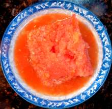 Тем временем помидоры разрезать пополам по экватору, натереть на крупной тёрке так, чтобы вся шкурка осталась в руках.