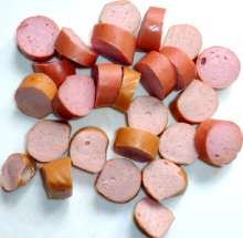Сосиски нарезать шайбами.
