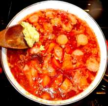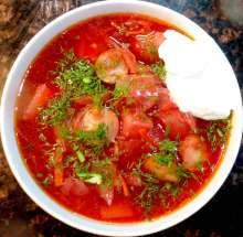 Классический русский борщ, но с региональными особенностями. Вкус этого борща интенсифицируется за счет добавления необычных мясных ингредиентов - копченостей и сосисок.