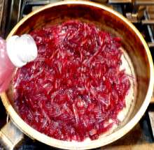 Выложить свеклу в нагретую сковороду с растительным маслом. Добавить уксус.