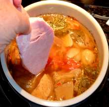 Выложить копчености в бульон. Варить на малом огне 30 минут.
