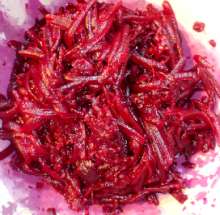 В оригинальном рецепте свекла тушится вместе с остальными овощами, но она имеет гораздо большее время приготовления, чем лук и морковь, поэтому я всегда тушу свеклу отдельно.