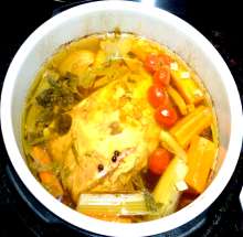 У меня – свиные рёбрышки, но бульон может быть любой, хоть куриный. Так утверждается в современных рецептах, хотя в старину использовался говяжий бульон (см. Историю).