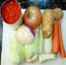 Бульон на свиных рёбрышках, помидоры в собственном соку, репа | Лук, морковь, стебель сельдерея, корень петрушки последовательно выкладываются в кастрюлю и пассеруются до мягкости, затем добавляется крупно нарезанная капуста, а через несколько минут – картофель. Ингредиенты заливаются горячим мясным бульоном, добавляются рубленные помидоры в собственном соку, репа и щи довариваются до готовности картофеля. |