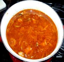 Копченые свиные рёбра, ветчина, копченая говядина, курица, сухие грибы, квашеная капуста, томатный соус. | Варится бульон на говяжьих костях с добавлением копченых свиных рёбер, процеживается, в нём отваривается «мясной набор» (ветчина, копченая говядина, курица). По готовности курицы добавляется зажарка (отваренные сухие грибы, лук, морковь, корень петрушки, квашеная капуста, томат, растительное масло), суп доводится до кипения и снимается с огня. При подаче заправляется чесноком и укропом. |