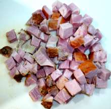 Ветчину нарезать кубиками, также, как мясо.
