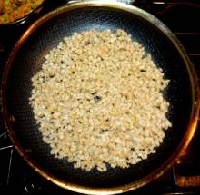 Обжарить перловку на сильном огне до светло-золотистого цвета.