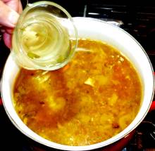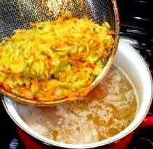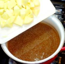 Выложить картофель в кипящий бульон.