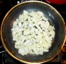 Выложить лук в нагретую сковороду с растительным маслом.