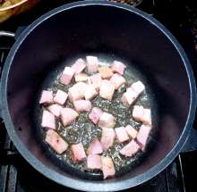 С ветчины срезать жир, нарезать кубиками, выложить в разогретую толстостенную кастрюлю.
