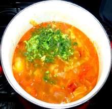 | Репа, помидор, фасоль консервированная, болгарский перец, томатная паста. | Варится бульон из утиных костей, процеживается, в него добавляется картофель, затем – нашинкованная капуста. Щи варятся почти до готовности картофеля, добавляется овощная заправка (пассерованные лук, морковь, стебель сельдерея, сладкий перец с томатом). Суп варится несколько минут, добавляется рубленная зелень, варится до изменения цвета, затем добавляется откинутая на сито консервированная фасоль. Суп доводится до кипения, заправляется рубленным чесноком, выправляется на соль и перец и снимается с огня. Готовые щи настаиваются, при подаче заправляются свежей зеленью и (по желанию) сметаной. |